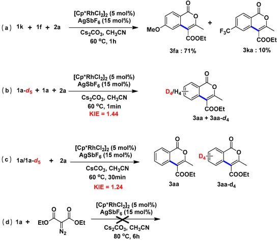 To obtain a more mechanistic insight, further experiments were carried out (Scheme 3). When p-methoxy-Boc-benzamide 1f was run in competition with the p-trifluoromethyl-Boc-benzamide 1k, the reaction favors the electron-donating substituent of the benzamide, suggesting that electrophilic-type benzamide were inherently less reactive (Scheme 3a). To gain further insights, the kinetic-isotope effect (KIE) was studied in parallel and competition experiments (Scheme 3b,c). Experiments with the same amounts of 1a and deuterium-labeled benzamide 1a–d5 were conducted, and a kH/kD value of 1.44 was obtained (Scheme 3b). Furthermore, separate reactions of 1a or 1a–d5 together with 2a gave the corresponding products 3aa and 3aa–d4, respectively, displaying the similar KIE value of 1.24 (Scheme 3c). These results suggested that C−H cleavage is likely involved in the rate-limiting step. Moreover, when 1a was treated with diethyl 2-diazomalonate, corresponding products was not observed under the standard reaction conditions, indicating that the final lactonization of ketone is significant in the transformation (Scheme 3d).