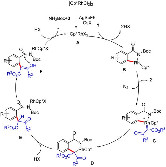 Based on the preliminary mechanistic experiments and literature precedents, a plausible mechanistic pathway is proposed in Scheme 4. Firstly, the catalytically active Rhodium species A is formed from [Cp*RhCl2]2, then the C-H metalation takes place to afford five-membered cyclometalated Rhodium species B via a Rh(III)-catalyzed C(sp2)-H bond cleavage. After insertion of the diazo compounds, Rh(III)-carbene species C can be formed with extrusion of N2. Subsequently, the species C undergoes a migratory insertion of carbene into the Rh-C bond, provided six-membered species D. Then, complex D could undergo protonation to give intermediate E, which can tautomerize to intermediate F. Finally, lactonization of intermediate F could afford the desired isocoumarin product 3 and the active catalyst A.