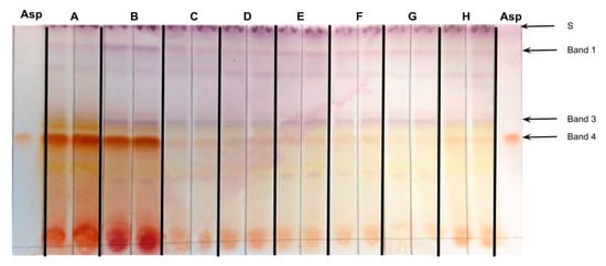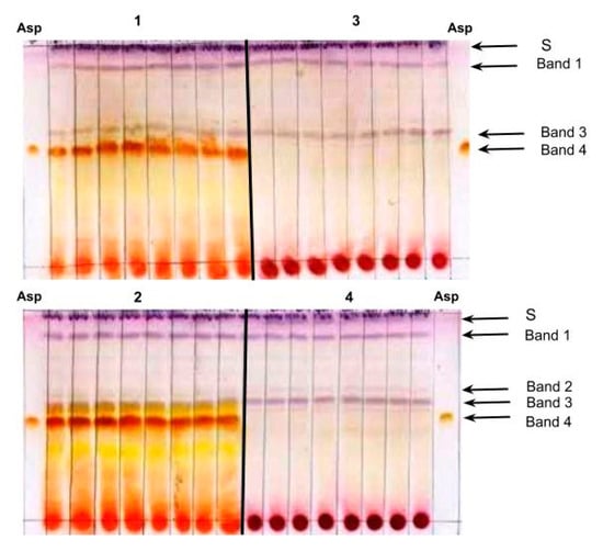 19]. Derivatization with p-anisaldehyde-H2SO4 not only produced distinct banding patterns, but also appeared to improve band resolution [