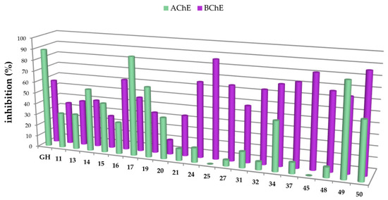 In this study, carboxamides with different triterpenoic backbones (ursolic, oleanolic, maslinic, betulinic, and platanic acids), and various amine residues (Scheme 1), were investigated. All compounds 11–50 (except those being not soluble under the conditions of the assay) were subjected to Ellman’s assays to determine their inhibition rates and constants (Ki for competitive inhibition and Ki′ for uncompetitive inhibition) for the cholinesterases AChE and BChE. Galantamine hydrobromide (GH), one of the gold standard drugs for treating AD symptoms, was used for comparison. In general, pre-screening the 37 triterpenoic acid amides using AChE (electric eel) and BChE (equine serum) identified seventeen compounds as potential inhibitors with inhibition rates equal or even better than GH. The results are summarized in Figure 2 and Figure 3 (details are found in the Supplementary Part, Table S1).