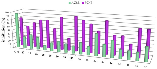 Percentage of inhibition of selected carboxamides and galantamine hydrobromide (GH as standard), final concentration of the inhibitor 10 µM, determined by Ellman’s assay using acetylcholinesterase (green in the front) and butyrylcholinesterase (purple in the back).