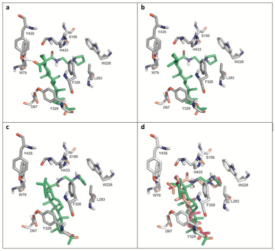 Figure 4 displays details of the docking arrangements of ligands with BChE. All ligands fit into the binding pocket—preferentially based on hydrophobic interactions (Figure 5) with the side chains of residues W79, W228, L283, Y329, and F326. The highest affinity was observed for 35 (Figure 4a). Thus a hydrogen bond of the acetyl group of 35 with the phenolic hydroxyl group of Y79 stabilizes the interaction with BChE. This hydrogen bond, however, is not present in compounds 31 and 34. The modifications in ring E of 31 (six-membered ring) compared to compounds 34 and 35 (five-membered rings) slightly changed the docking arrangement (cf. Figure 4d) and caused reduced hydrophobic interactions in particular with W79.