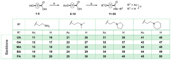 Acetylation of triterpenoic acids (Figure 1, 1–5) furnished acetates 6–10 (Scheme 1). Reaction of 6–10 with oxalyl chloride and subsequent treatment with various amines derived from ethylene diamine gave carboxamides 11–15, 21–25, 31–35 and 41–45. Their deacetylation with KOH/MeOH gave compounds 16–20, 26–30, 36–40 and 46–50, respectively.