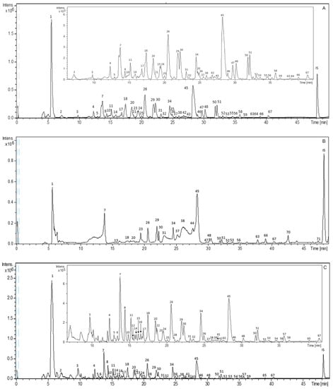 Base Peak Chromatograms (BPCs) of representative Sclerocarya birrea extracts obtained with different extraction techniques: (A) solid–liquid extraction (SLE); (B) supercritical fluid extraction (SFE), and (C) pressurized liquid extraction (PLE). Peak numbers correspond to those of Table 1.