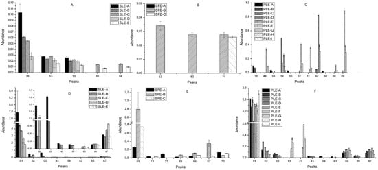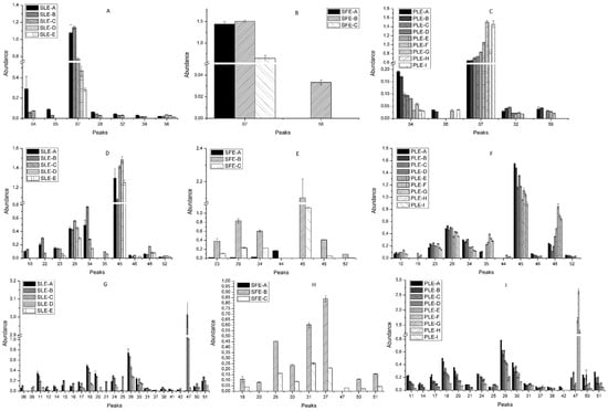 The last category includes other phenolic compounds with different chemical structures, sugars, and others. Comparing the number of compounds obtained with the three techniques, PLE was the best option for the extraction of the compounds in this group (Figure 3F), although the abundance of peaks 1, 2, and 3 was higher when using SLE, in particular in high water percentage conditions (Figure 3D). On the other hand, compounds such as ellagic acid (peak 67) appeared with major intensity when the percentage of ethanol was about 75% using all methodologies, being SFE-B significantly better than the other conditions.