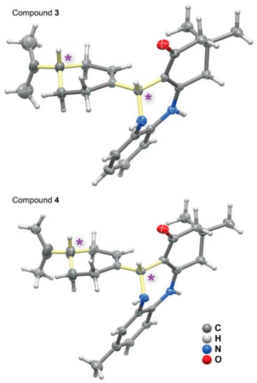 Single-crystal X-ray diffraction studies were further used to determine the spatial arrangement of the new compounds 1–4 (Figure 3 and Figure 4). Crystals of compounds 1–4 were directly obtained from the reaction batches after filtration and washing with ethanol. This is noteworthy because use of the natural (S)-(−)-perillaldehyde as a starting chiral reagent means that all the resulting structures crystallized in chiral and non-centrosymmetric space groups. The absence of strongly diffracting elements in all structures means that the absolute configurations of asymmetric carbons could not be determined from the X-ray studies, but they were nevertheless unveiled from the chiral HPLC studies performed.