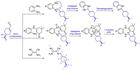 Following this last method, we propose herein the hemi-synthesis of novel chiral imine, benzimidazole and benzodiazepine structures from the essential oil of A. leucotrichus by condensation of its major constituent (S)-(−)-perillaldehyde (81.0%) with different amine substrates, such as 2,3-diaminomaleonitrile, o-phenylenediamine and 3-[(2-aminoaryl)amino]dimedone. The GC-MS analysis of our A. leucotrichus essential oil allowed the identification of perillaldehyde (81.0%) and limonene (12.4%) as major constituents (see Supplementary Materials). The combination of amines with the enantiopure perillaldehyde may lead to functional synergy and render the final chiral molecules with improved biological properties, since it is well-known that the biological effect is intrinsically related to one of the enantiomers. In addition, the toxicological, pharmacokinetic behaviour and metabolism of the enantiomers may also be different [23].