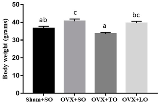 Effect of soybean oil (SO), tea oil (TO), and lard oil (LO) on body weight in ovariectomized and high-fat-diet-induced obese mice at the end of the experiment. Data are presented as mean ± SEM, n = 8 mice/group. Bars with different letters (a, b, c) indicate a significant difference at p < 0.05 determined using one-way ANOVA.