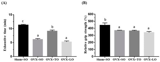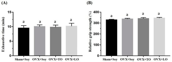 The basal levels of physical activities before the supplementation and induction are illustrated in Figure 2, and there were no significant differences in exhaustive swimming endurance and grip strength among the groups (F(3, 28) = 0.115, p = 0.95, η2 = 0.112 and F(3, 28) = 0.956, p = 0.432, η2 = 0.194, respectively). However, the exhaustive swimming endurance and grip strength were significantly different among the groups (F(3, 28) = 67.25, p < 0.0001, η2 = 0.910 and F(3, 28) = 5.619, p = 0.006, η2 = 0.457, respectively) at the end of experiment (Figure 3), and the ovariectomy resulted in significant reductions in the exhaustive swimming time and forelimb grip strength (p < 0.05). The exhaustive swimming time was longer in the OVX+TO group than in the OVX+SO and OVX+LO groups (p < 0.0001). Thus, the exhaustive swimming time in the OVX+TO group was significantly higher by 49% and 72% than those in the OVX+SO and OVX+LO groups, respectively. Therefore, replacing SO and LO with TO can lengthen the exhaustive swimming time in HFD-induced obese OVX mice. In terms of the grip strength, there was no significant difference among the three OVX groups, but the SO, TO, and LO treatments showed a significant decrease by 16–23% as compared to the Sham+SO group (p = 0.045, 0.032, and 0.005, respectively).