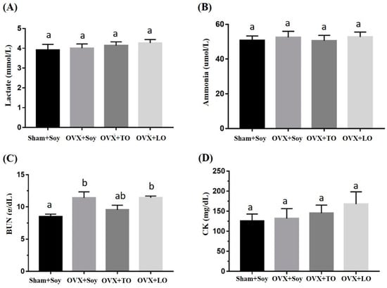 Effects of soybean oil (SO), tea seed oil (TO), and lard oil (LO) on (A) lactate, (B) ammonia, (C) BUN, and (D) CK levels in ovariectomized and high-fat-diet-induced obese mice. After 12 weeks of intervention, fatigue-associated biochemical indices were assessed before a swimming test. Data are presented as mean ± SEM, n = 8 mice/group. Bars with different letters (a, b) indicate a significant difference at p < 0.05 determined using one-way ANOVA.