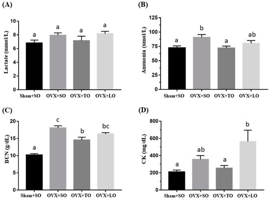 Effects of soybean oil (SO), tea seed oil (TO), and lard oil (LO) on (A) lactate, (B) ammonia, (C) BUN, and (D) CK levels in ovariectomized and high-fat-diet-induced obese mice. After 12 weeks of intervention, fatigue-associated biochemical indices were assessed after a 10 min swimming test. Data are presented as mean ± SEM, n = 8 mice/group. Bars with different letters (a, b, c) indicate a significant difference at p < 0.05 determined using one-way ANOVA.