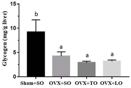 As shown in Figure 6, the liver glycogen content exhibited significant differences among treatments (F(3, 28) = 4.9, p = 0.01, η2 = 0.524), and the levels in the OVX+SO, OVX+TO, and OVX+LO groups were lower by 54% (p = 0.042), 68% (p = 0.015), and 65% (p = 0.021), respectively, than that in the Sham+SO group. Moreover, no significant differences in liver glycogen content was noted among the OVX+SO, OVX+TO, and OVX+LO groups.