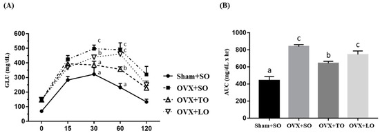 The effects of SO, TO, and LO on oral glucose tolerance and area under the curve (AUC) in OVX mice are shown in Figure 7A,B, respectively. The OVX+SO group exhibited significantly decreased oral glucose tolerance and increased AUC compared with the Sham+SO group. In the glucose tolerance test, shown in Figure 7A, a significant difference was observed for the main effects of both treatment and time (F(3, 28) = 27.1, p < 0.0001, and F(4, 88) = 87.4, p < 0.0001, respectively). However, the OVX+TO group exhibited significantly increased oral glucose tolerance when compared with the OVX+SO group by Tukey post-hoc analysis (p = 0.0001). In addition, the interaction effect (treatment × time) also demonstrated a significant difference (F(12, 88) = 1.88, p = 0.049). Additionally, there was a significant difference among groups in terms of AUC index (F(3, 28) = 24.02, p < 0.0001, η2 = 0.783) (Figure 7B), and the Sham+SO group exhibited a significantly lower AUC than did the OVX+SO (p < 0.0001), OVX+TO (p = 0.003), and OVX+LO (p < 0.0001) groups. Among the OVX treatments, the OVX+TO group exhibited the smallest AUC compared to the OVX+SO (p = 0.004) and OVX+LO (p = 0.042) groups.