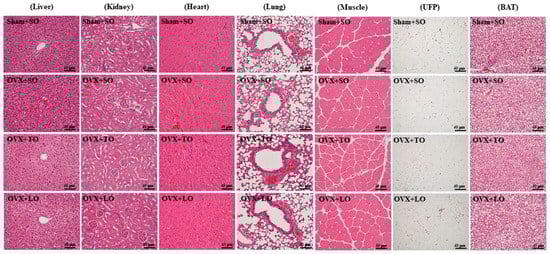 No significant difference in food intake was observed among the Sham+SO (3.10 ± 0.06 g), OVX+SO (2.92 ± 0.06 g), and OVX+TO (2.91 ± 0.06 g) groups. However, the food intake of the OVX+LO group (2.88 ± 0.10 g) was significantly lower than those of the other groups (p < 0.05). The initial body weights were 32.9 ± 0.08, 33.9 ± 0.08, 33.7 ± 0.08, and 33.8 ± 0.07 g in the Sham+SO, OVX+SO, OVX+TO, and OVX+LO groups, respectively, and it did not significantly differ among the groups (F(3, 28) = 0.345, p = 0.786, η2 = 0.137). After supplementation and high-fat diet induction (Figure 1), a significant difference was observed among groups (F(3, 28) = 8.956, p = 0.001, η2 = 0.576), and body weight gain was significantly higher in the OVX+SO group than in the Sham+SO group (p < 0.05). However, the body weight in the OVX+TO group was significantly decreased compared with that in the OVX+SO and OVX+LO groups (p < 0.05). As shown in Table 1, the relative tissue weights (liver, heart, lung, and brown adipose tissue (BAT)) of the mice in the OVX+SO group were significantly lower than those of the Sham+SO group. Also, uterus fatty peripheral (UFP) and total fat (TF) contents in the OVX+SO group were higher than those in the Sham+SO group (p < 0.05). However, the relative tissue weights of the liver, heart, lung, muscle, and BAT mass were significantly elevated in the OVX+TO group, whereas the relative tissue weights of UPF and TF were decreased compared with these weights in the OVX+SO and OVX+LO groups.