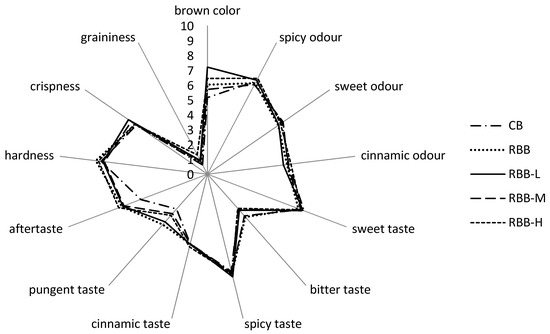 The influence of buckwheat flour and varying doses of rutin addition is presented in Figure 1. After addition of buckwheat flour, the overall quality of RBB (5.8) decreased in comparison to control ones (6.4). These findings are in agreement with Bajleet et al. [24], who reported that the incorporation of buckwheat flour decreased consumer acceptance of buckwheat based-product. The overall quality score of rye-buckwheat biscuits was established at 5.7, 5.9 and 6.2 for RBB-L, RBB-M and RBB-H, respectively. A score at a level of 6.2 was also achieved for the buckwheat biscuits of Bajleet et al. [24] with 30% buckwheat incorporation. Moreover, the positive acceptance of buckwheat product was proven by Chlopicka et al. [17]. It can be said that rutin addition didn’t significantly influence the acceptance score of rye-buckwheat biscuits. In detail, the 13 sensory descriptors were evaluated by panelists assessing: color, aroma, taste and texture of rye-buckwheat biscuits. The statistically significant difference was observed in color acceptance (p < 0.0001). Therefore, the acceptability of color was lowest for control while the best score was achieved for RBB-L. The 30% incorporation of buckwheat flour significantly increased the color acceptance from 5.13 to 6.03 (p < 0.0001). A similar observation about color of buckwheat-based bread was presented by Lin et al. [25], who reported that buckwheat improved breads’ color due to high phenolic content inhibiting the browning compounds’ formation via Maillard reaction during baking. Moreover, the color of rye-buckwheat biscuits is more attractive than for rice-buckwheat cookies with the same amount of buckwheat flour [19].