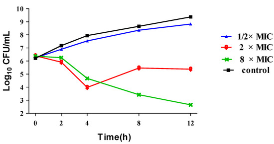 To further confirm the antibacterial activities of this kind of compounds, the time–kill curve assay of compound 15a for MRSA strain isolated from Chinese patients was carried out subsequently with DMSO as a negative control. As shown in Figure 2, distinct reductions of the viable cell counts were observed after 4 h exposure of the bacteria to 15a at concentrations of 2× and 8×MIC. Especially, it exhibited significant time-dependent action and the maximum reduction in viable counts was over 6 log10CFU/mL in 12 h for the 8× MIC, therefore, it was determined that 15a was a marginal bactericide [18] at the concentration of 8× MIC.