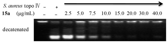Taking into account the planar rigid structure similarity between 15a and quinolones, we initially examined its effects on gyrase and topoisomerase (topo) IV activities of S. aureus by gyrase-mediated supercoiling of relaxed DNA assay and topo IV-mediated decatenation of kinetoplast DNA (kDNA) assay [19,20], respectively. As shown in Figure 3, topo IV-mediated decatenation activity was significantly inhibited in a concentration-dependent manner after treatment of 15a. It could partially inhibit topo IV activity at the concentration of 7.5 μg/mL (lane 5), and block almost completely the decatenation reaction at the concentration of 15 μg/mL (lane 7). However, inhibition activity on gyrase-mediated supercoiling was not distinctly observed after treatment with 15a at even upped to 100 μg/mL. These results indicated that 15a could effectively suppress the topo IV-mediated decatenation activity, but a different mode of action from quinolones.