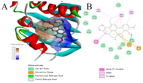 It was reported that topo IV enzyme of Gram-positive bacteria possesses at least two active pockets, one is the well-known quinolone-binding cavity and the other is kibdelomycin-binding site [21,22,23]. In view of the good activity of compound 15a against quinolone-resistant MRSA or VISA, we performed molecular docking between the topo IV binding site of kibdelomycin and compound 15a interactions using Discovery Studio 4.5 software (Edition 4.5; BIOVIA: San Diego, CA, USA, 2015) [17,24]. As expected, compound 15a fit well in the active hydrophobic pocket of the binding site (Figure 4A, brown area). One conventional hydrogen bond with GLU53, two attractive charges formed by nitrogen ions with ASP76 and GLU53, van der Waals forces and hydrophobic interactions (Figure 4B) contributed together to the strong interactions. The results suggested that 15a might bind to the kibdelomycin-pocket site on topo IV, a different mode of action from the quinolones widely used in the clinic.