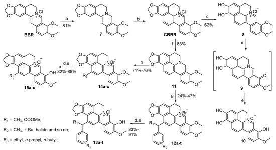 - Fan, T.Y.; Wang, Y.X.; Tang, S.; Hu, X.X.; Zeng, Q.X.; Pang, J.; Yang, Y.S.; You, X.F.; Song, D.Q. Synthesis and antibacterial evaluation of 13-substituted cycloberberine derivatives as a novel class of anti-MRSA agents. Eur. J. Med. Chem. 2018, 157, 877–886. [Google Scholar] [CrossRef] [PubMed]