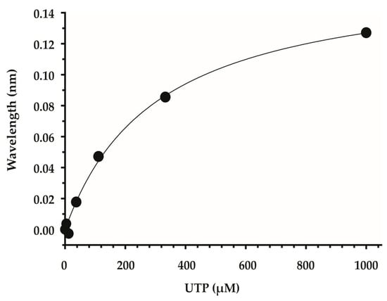 LmUSP was expressed in bacteria with an N-terminal biotin acceptor peptide (BAP epitope), purified, and subsequently biotinylated by incubation with the biotin ligase BirA. Immobilization of biotinylated LmUSP to Super Streptavidin (SSA) biosensors was then assessed. Upon assessment by biolayer interferometry, LmUSP showed a measured wavelength shift of ~4 nm, with a loading enzyme concentration of 12.5 µg/mL. A natural ligand of LmUSP, UTP, was used as the positive control to test for binding. A set of eight SSA biosensors were loaded with a 12.5 µg/mL solution of biotinylated LmUSP, and immersed in UTP solutions of various concentrations, ranging from 1.3 µM to 1 mM. Despite the sub-optimal immobilization level of LmUSP on the SSA biosensors, UTP bound in a dose-dependent manner (Figure 1). In this experiment, the estimated equilibrium dissociation constant (KD) for UTP was 89 µM, which correlates well with the Km value of 100 µM reported previously [21].