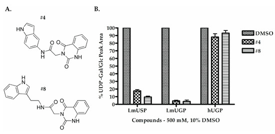 Structure and in vitro inhibitory activity of compounds #4 and #8 against LmUSP, Lm UDP-glucose pyrophosphorylase (UGP), and hUGP. (A) Structure of compounds #4 and #8. (B) In vitro activity of LmUSP, LmUGP, and hUGP in the absence (DMSO control), and the presence of 500 µM compounds #4 or #8. Compounds were dissolved in DMSO, and all assays were performed in the presence of 10% DMSO. Data were normalized to the DMSO control. Error bars are given as standard deviations from three independent experiments, each with three technical replicates.