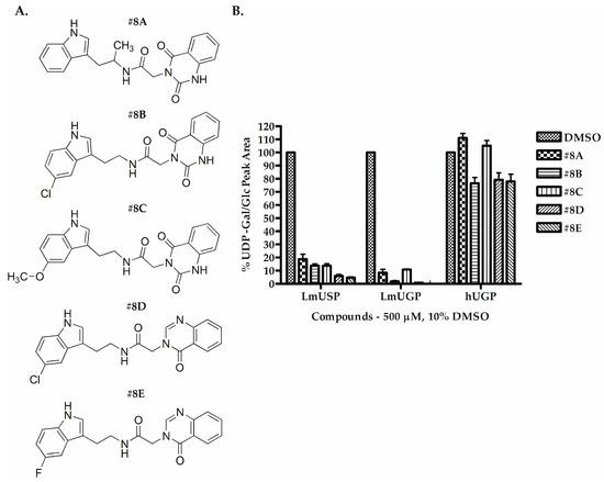 Five commercially available analogs of compound #8 were subsequently tested for activity against LmUSP, LmUGP, and hUGP, at an initial concentration of 500 µM. The compounds, named #8A to #8E (Figure 4A), showed more than 85% reduction of LmUSP and LmUGP in vitro activity (Figure 4B). At this high concentration, compounds #8B, #8D and #8E also showed a clear inhibition of hUGP (Figure 4B).