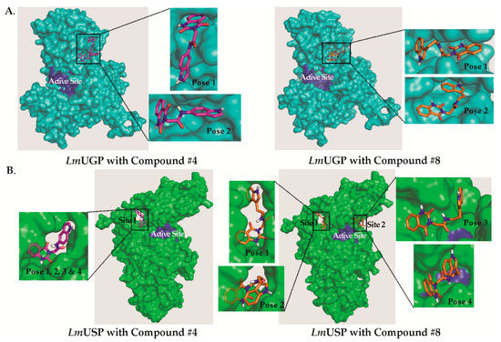 Computational docking was used to predict the favored binding sites for compounds #4 and #8 on LmUGP and LmUSP (Figure 5) using AutoDock software. Both compounds were predicted to bind to LmUGP at an allosteric site that was previously shown to be functionally relevant (Figure 5A) [42]. Inhibitor binding in this area is expected to impede the closing of the LmUGP catalytic pocket, which is necessary for an efficient enzymatic reaction [42,47].