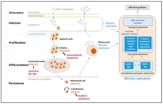 EBV life cycle, latency stages and derived lymphomas. The viral life cycle includes at least five different stages (virus entry, infection, proliferation, differentiation and persistence), and four of them are associated with EBV diseases. The virus is transmitted through the saliva and infects naïve B-cells in the oropharyngeal mucosa. During primary infection, EBV-infected naïve B-cells express the entire latency gene complex (10 proteins: EBV nuclear antigens (EBNAs), latent membrane protein (LMPs)) as well as EBV-encoded small RNAs (EBERs) and microRNAs. This is called type III latency and this form of latency activates the resting B-cells and drives them to proliferation and transformation. However, these cells are highly immunogenic and are rapidly eliminated by EBV-specific T cells. The virus is able to survive in B-cells because it downregulates its immunogenic proteins. EBV mimics antigen driven B-cell responses and similar to antigen-stimulated blasts, the EBV-infected B-cells enter the follicles, expand, and form germinal centers where they express only three viral proteins (type II latency). Finally, they exit the lymph node expressing only a single viral protein (EBNA1, which ensures that the viral genome divides with the cellular genome) (type I latency). The entry of EBV-infected cells into the peripheral blood results in the shutdown of all viral genes encoding for proteins; this is called latency 0 or latency program where no viral proteins are expressed. Resting memory cells, in which the virus is quiescent, are not attacked by the host immune system and are likely the sites of long-term persistence. Memory B cells occasionally divide to maintain stable number of cells and when a cell that is carrying the virus divides, the viral EBNA1 protein is expressed to allow the viral genome to replicate along with the cell. Memory B-cells may also undergo terminal differentiation into plasma cells and secrete antibodies. If such a cell contains the virus, the EBV lytic program is activated and the infectious virus released from the plasma cells can infect epithelial cells, where the virus can replicate and be shed at high amounts and then be transmitted to other hosts. With the exception of latency type 0, each latency state is found in specific types of EBV-associated malignancies.