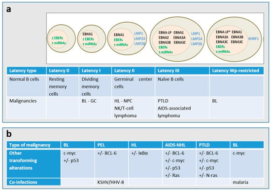 (a) Patterns of gene expression during EBV latency. The majority of the endemic BL presents a latency I type and carry a wild-type transformation-competent EBV genome and express only the Epstein–Barr nuclear antigen 1 (EBNA1) from the EBNA1-specific latent promoter Qp, non-coding EBERs (Epstein–Barr virus-encoded small RNAs) and several microRNAs (miRNAs). Around 15% of BL endemic tumors, the so called Wp-restricted BLs, carry an EBNA2 gene-deleted genome and express EBNA1, -3A, -3B, and-3C and the viral Bcl2 homologue BHRF1 from the Wp latent promoter [2,6]. * The EBNA-LP gene is partially deleted in the Wp-restricted latency. A major type of latency in EBV-associated malignancies is latency II, in which the latent membrane proteins LMP1, LMP2A, and LMP2B are expressed in addition to the Latency I genes. The entire EBV latency gene complex, which consists of several EBNA proteins, LMP1, LMP2A, LMP2B, EBERs, and miRNAs are expressed in the type III latency. (b) The cellular genetic alterations and/or co-infections are known to occur in the different types of EBV-associated malignancies. PEL: primary effusion lymphoma; HL: Hodgkin lymphoma; BL: Burkitt lymphoma; NHL: non-Hodgkin lymphoma; PTLD: post-transplant lymphoproliferative disorder; NPC: nasopharyngeal carcinoma; GC: gastric carcinoma.