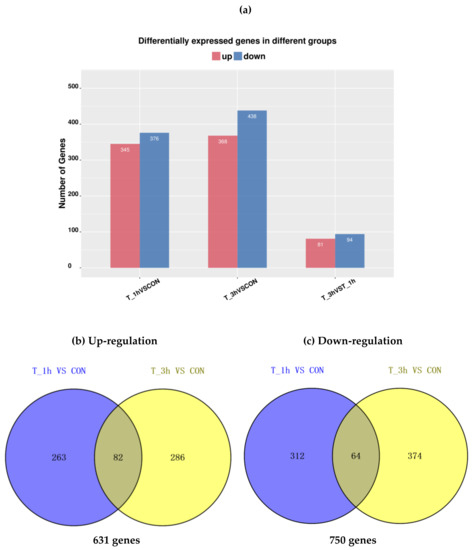 In total, 52,878 genes were detected in three stages (CON, T_1h, and T_3h) in the AJBW through RNA-seq analysis. Among them, 57.40% (30,350 genes) were mapped to the reference genes with homologous sequences in at least one of the databases (Supplementary Table S1). Moreover, 5415 (17.84%) showed significant matches to Gene Ontology (GO); 3301 (10.88%) to Kyoto Encyclopedia of Genes and Genomes (KEGG); 19,149 (63.09%) to NCBI nonredundant protein sequences (Nr); 12,834 (42.29%) to Swissprot; and 14,875 (49.01%) to Protein family (Pfam). In short, approximately 69.57% (21,115 genes) of the total annotated genes from the AJBW were noted by the main five common databases.