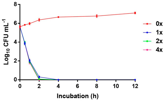 The killing kinetics of the compound on MRSA ATCC 43300 at 0×, 1× (4 µg·mL−1), 2× (8 µg·mL−1), and 4× (16 µg·mL−1) MIC was determined according to the method described previously [38] with some modifications. Bacterial and yeast suspensions were diluted to 1 × 106 CFU·mL−1. The compound concentrations were adjusted to 1× MIC, 2× MIC, and 4× MIC. Cultures treated with the varying concentrations of the compound were incubated at 37 °C for 0, 0.5, 1, 2, 4, 8, and 12 h. Aliquots of 100 µL were pipetted out from each tube at each time point, serially diluted in phosphate-buffered saline (PBS) and spread onto Mueller Hinton Agar MHA plates. Tubes without the compound served as growth controls (0×). The plates were incubated at 37 °C for 24 h followed by the enumeration of the colonies. Killing curves were constructed by plotting the log10 CFU·mL−1 versus time over a 24 h time period. A decline in bacterial/fungal growth to ≥3log10 CFU·mL−1 from the initial inoculum was considered to be bactericidal/fungicidal.