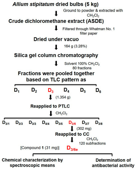 TLC analysis of the Allium stipitatum dichloromethane (ASDE) extract showed the presence of large, clear spots when visualized under a UV chamber and iodine staining. The crude dichloromethane extract of A. stipitatum bulbs (164 g) was subjected to silica gel column chromatography (CC) using CH2Cl2 as the mobile phase. A total of 80 fractions (50 mL in volume) were collected in 100-mL conical flasks. All fractions were subjected to TLC analysis. Fractions that showed similar TLC patterns were pooled together which yielded six major fractions (D1–D6). The six fractions (D1–D6) were tested for their antibacterial activity against MRSA. Fraction D3 (1.354 g) which exerted remarkable antibacterial activity, was subjected to preparative thin-layer chromatography (PTLC) using CH2Cl2 as the mobile phase to yield eight subfractions (D3/1–D3/8). Subfraction D3/6 (302 mg) was further subjected to column chromatography (CC) using CH2Cl2 as the mobile phase to yield 120 fractions (10 mL in volume). Fractions were pooled together based on TLC patterns. Subfraction D3/6e (31 mg) was identified as a pure fraction and subjected to NMR and mass analysis. The purification scheme of fraction D3/6e is illustrated in Scheme 1. At each purification step, the fractions and subfractions were tested for their antibacterial activity using the micro-broth dilution method.