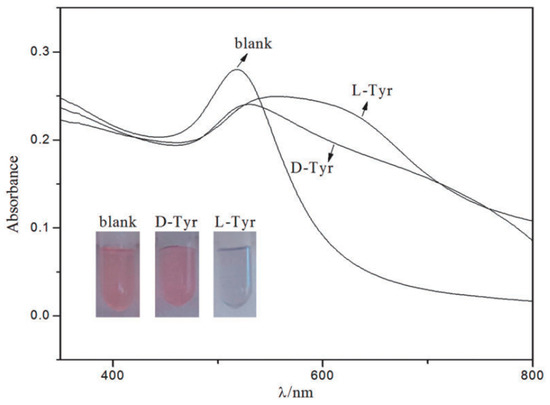 - Su, H.; Zheng, Q.; Li, H. Colorimetric detection and separation of chiral tyrosine based on N-acetyl-l-cysteine modified gold nanoparticles. J. Mater. Chem. 2012, 22, 6546–6548. [Google Scholar] [CrossRef]