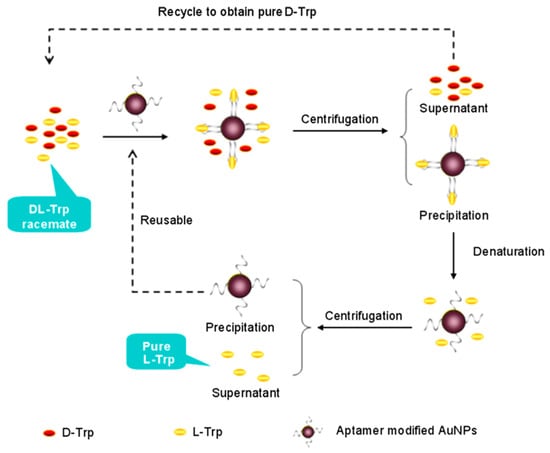 | Centrifugation | Functional nucleic acids-modified AuNPs | Diameter of AuNPs (for best separation efficiency): 55nm | d,l-Trp | [69] | ||