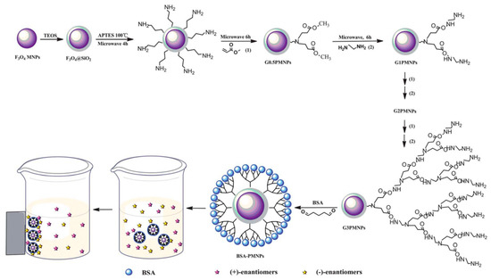 - Wang, Y.; Su, P.; Wang, S.; Wu, J.; Huang, J.; Yang, Y. Dendrimer modified magnetic nanoparticles for immobilized BSA: A novel chiral magnetic nano-selector for direct separation of racemates. J. Mater. Chem. B 2013, 1, 5028–5035. [Google Scholar] [CrossRef]