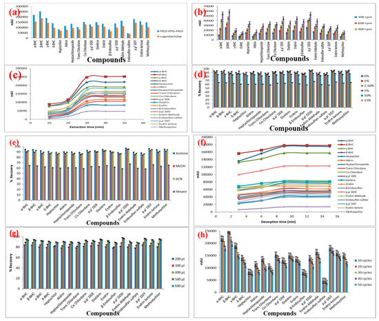 To evaluate the effect of the solvent volume for complete desorption of the analyte on the extraction recovery, the volume of six different solvent volumes of acetone containing 10 ng/mL OCPs were investigated using the proposed approach. As shown in Figure 2g, the analytical signals for all the OCPs increased and reached their optimum levels when the solvent volume increased from 100 to 400 µL. The extraction sensitivity reduces when the solvent volume was further increased to 500 and 600 µL. Based on the results obtained, a desorption time of 9 min was selected for the subsequent analysis with desorption solvent volume at 400 µL.