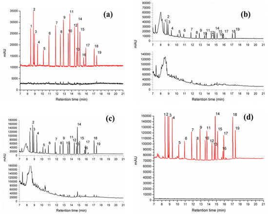 FPSE/GC-MS chromatograms of OCPs in real samples using sol-gel PEG-PPG-PEG coated FPSE media: (a) blank and spiked tap water; (b) blank and spiked apple juice; (c) blank and spiked pomegranate juice; (d) blank and spiked litchi juice. [Spiked concentration: 5 ppb].