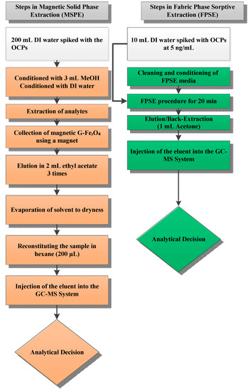 The capability of the present method was compared with other extraction methods previously reported for the determination of OCPs, with the results being summarized in Table 3. The proposed method demonstrated satisfactory linearity, lower RSD values and comparable recoveries compared with the reported methods. The LOD values of present work were lower than those reported methods (Table 4). FPSE media have a large surface area that greatly increases the contact between analytes and sorbent. This in turn speeds up the extraction process with shorter extraction equilibrium time. Moreover, sol-gel FPSE media was directly inserted into the sample solution for extraction, and hence its usage was very simple. The sponge-like porous architecture of sol-gel sorbent and the capillary action of cellulose fabric synergistically diffuse the organic solvent into the sol-gel sorbent network during back-extraction and allows quantitative recovery of the extracted analytes even when a small volume of organic solvent is used. As such, FPSE also eliminates solvent evaporation and sample reconstitution, often considered to be an integral operation in solid phase extraction. A comparison between magnetic solid phase extraction and fabric phase sorptive extraction workflow is presented in Figure 4. As the schematic demonstrates, FPSE substantially simplifies the sample preparation workflow.