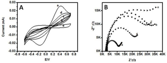 Cyclic voltammetry (CV) and EIS are widely used techniques to characterize the electrode/electrolyte interfacial properties at different modification steps of aptasensor fabrication. Thus, the different preparation stages were investigated by recording the impedance spectra and cyclic voltammograms of the modified electrode in the presence of the reversible [Fe (CN)6]4−/3− redox system, shown in Figure 1.