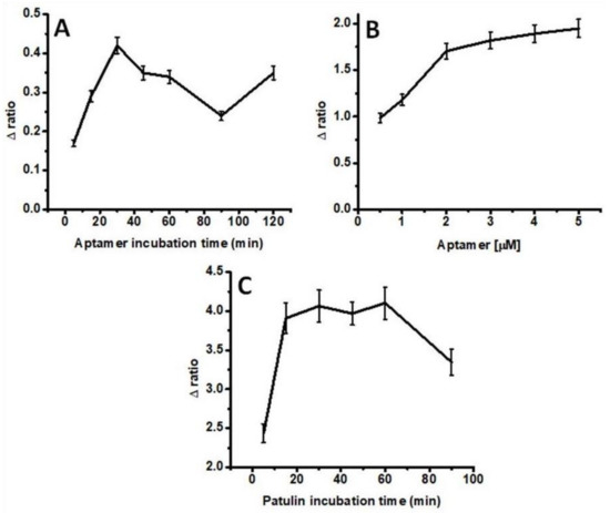 The concentration of the aptamer is another important parameter. We recorded the Δratio for aptamer concentration ranging between 0.5 and 5.0 µM. Results in Figure 2B indicated that the maximum Δratio was observed at a 2.0 µM concentration. Therefore, 2.0 µM was considered as the optimum concentration and was used in the following experiments.