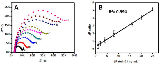 (A) Nyquist plot of the aptasensor after incubation with different PAT concentrations: (a) bare, (b) 1 ng mL−1, (c) 2 ngmL−1, (d) 4 ng mL−1, (e) 8 ng mL−1, (f) 16 ng mL−1, (g) 20 ng mL−1, (h) 25 ng mL−1, and (i) 50 ng mL−1. (B) Calibration plot of Δratio with increasing PAT concentration.