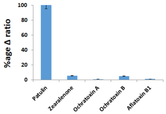 Effective detection of low molecular weight toxic molecules is vital in areas such as environmental monitoring and the food industry [1,2,3]. Mycotoxins are small agro-based food contaminants that pose serious health threats to humans and animals [4]. Patulin (PAT) is a low molecular weight mycotoxin produced by various fungal species. This small mycotoxin is commonly present in fruit- and vegetable-based products, especially apples [5,6]. The antibiotic properties of PAT were firstly reported in 1940. Some studies have also shown the adverse health effects of PAT on higher plants and animals [7]. Extensive studies have been carried out to highlight the health risks of PAT, and it has been concluded that PAT exhibits several chronic, acute, and cellular level toxic effects both on human and animals [8]. PAT has neurotoxic, immunosuppressive, and mutagenic effects on several animal species and cause severe damage to the intestinal epithelium, which leads to degeneration, inflammation, ulceration, and bleeding [8,9]. Due to such pronounced toxicities, different authorities have set regulatory limits for PAT in food. The European Union (EU) is the first organization that defined a maximum admissible limit, i.e., 50 μg L−1 [10].