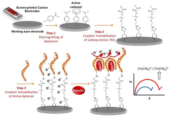 Diazonium deposition was then followed by the chemical grafting of carboxy-amine PEG through the amide bond. The long spacer arms of heterobifunctional PEG acted like tunnels for the electrons of the redox marker to reach the surface of the electrode. The second part of the diblock, i.e., the anti-PAT aptamer, acted as gates for these tunnels. In the absence of a targeted analyte, the aptamer remained unfolded, and it is assumed that the gates were opened, thereby permitting the electron transfer from the redox probe to the surface of the electrode. Meanwhile, in the presence of the targeted analyte, 3D conformational changes in the aptamer structure resulted in the formation of an aptamer-PAT quadruplex complex that locked the gates of tunnels, resulting in blockage of the electron flow toward the electrode surface [24]. Furthermore, the conformational changes in the aptamer structure also resulted in the exposition of the negatively charged backbone of the aptamer. Consequently, steric hindrance after the formation of the quadruplex complex and the electrostatic repulsion between the anionic ferri/ferrocyanide redox system and the negatively charged aptamer collectively increased the impedance of the system. The higher the concentration of PAT is, the higher the impedance will be. This concept makes the quantitative detection of PAT feasible.