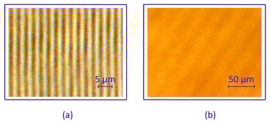 One possibility for avoiding secondary grating formation is to apply a single-beam exposure []. This technique was applied in the case of the reflection grating shown in Figure 1b. In this case, the grating period is determined by the incidence angle of the recording beam only. According to the suboptimal visibility of the interference pattern, a false-color display was used to improve the visibility of the grating in the microscopic image. As a drawback of this method, the low visibility of the interference pattern results in suboptimal contrast. This is contrary to the aim of achieving optimal material response with the highest possible diffraction efficiency.