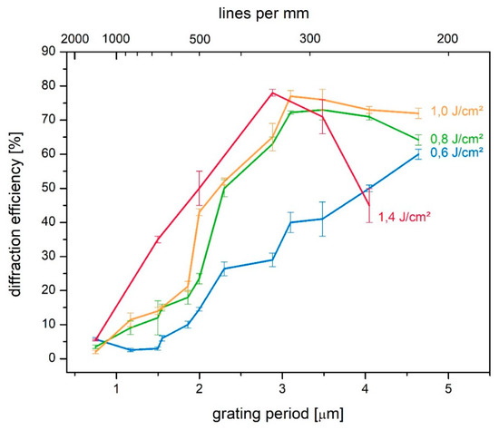 The optimum material response can be derived from Figure 2. Grating periods around Λ = 3 µm, i.e., approximately 350 lines/mm, resulted in the highest diffraction efficiency. Thus, the optimum spatial frequency response of the epoxy-based material is comparable to that of acrylamide-based photopolymers []. With respect to the influence of the exposure dose, Figure 2 reveals that the optimum spatial frequency response depends on the energy density of the exposure—a decrease in the exposure dose results in a shift of the optimum spatial frequency response towards larger grating periods. In the case of the low-energy response curve (0.6 J/cm2, blue curve in Figure 2), the optimum is not even achieved within the illustrated range and thus is expected to be above 5 µm. In the high spatial frequency range, increasing the energy density of the exposure results in a higher diffraction efficiency, while for the low spatial frequency range it can be stated that a lower energy density of exposure results in a higher optimal material response. Since the low dose is achieved by means of a short exposure, this is in compliance with preliminary results on the performance of this material, indicating that a short exposure duration is preferable for the material response [].