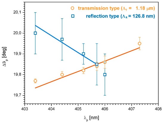 The calculation is based on Equation (1). The corresponding parameters are λexp = 405.7 nm for the wavelength of exposure and θ = 20° with regard to the exposure geometry, resulting in a transmission grating period of ΛT = 1.18 µm and a reflection grating period of ΛR = 126.8 nm. The indistinguishability of the Bragg angles in the event of probing with the wavelength of exposure (λp = λexp) is also apparent from Figure 3.