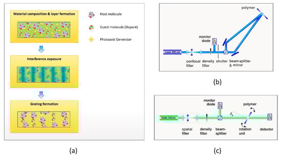 Overview on Materials and Methods: (a) Schematic illustration of composition, exposure, and grating formation for the host–guest material. (b) Holographic exposure setup with geometry for transmission gratings. (c) Rotation-scan setup.
