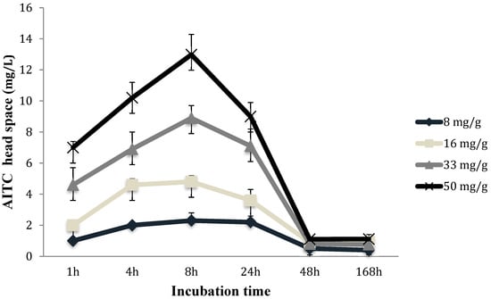 Volatilization kinetics of the AITC contained in the plastic trays produced through the sinigrin conversion obtained from 8, 16, 33 and 50 mg/g of oriental mustard flour incorporated in the bioactive sauce.