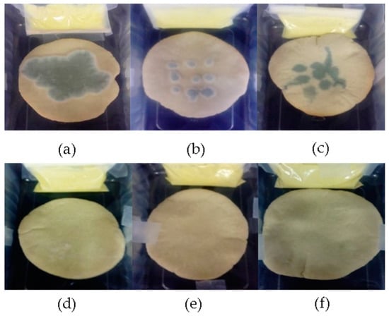 Pita bread inoculated with P. verrucosum and stored during 7 days in a plastic tray containing a small sachet sealed with (a) control experiment (b) pita bread treated with the preservative compound E-282, (c) 8 mg/g, (d) 16 mg/g, (e) 33 mg/g, and (f) 50 mg/g of oriental mustard flour sauce.