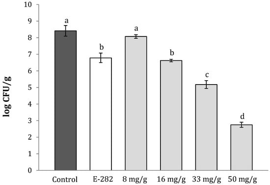 The results of visible fungal growth on the pita bread exposed to the AITC vapors generated by sinigrin conversion are according to the microbial population detected in the bread after 7 days of incubation (Figure 2). In particular, as shown in Figure 3, the control experiment presented 8.3 logs UFC/g, whereas the bread produced with the E-282 additive, evidenced fungal contamination of 6.8 logs UFC/g, 1.5 logs lower than the data observed in the control experiment. The application of 8 mg/g of the OMF did not produce any significant decrease in the fungal population when compared to the control experiment and with the bread baked with E-282, whereas using 16, 33 and 50 mg/g of the OMF, the log of the UFC/g of P. verrucosum detected was of 6.8, 5.2 and 2.6, respectively. The log reduction of P. verrucosum for the treatments of 16, 33 and 50 mg/g was the 1.5, 3.1 and 5.7, respectively, in comparison to the control group.